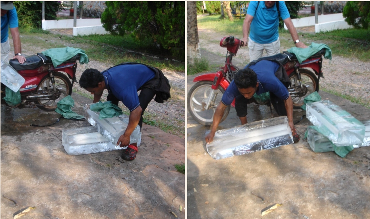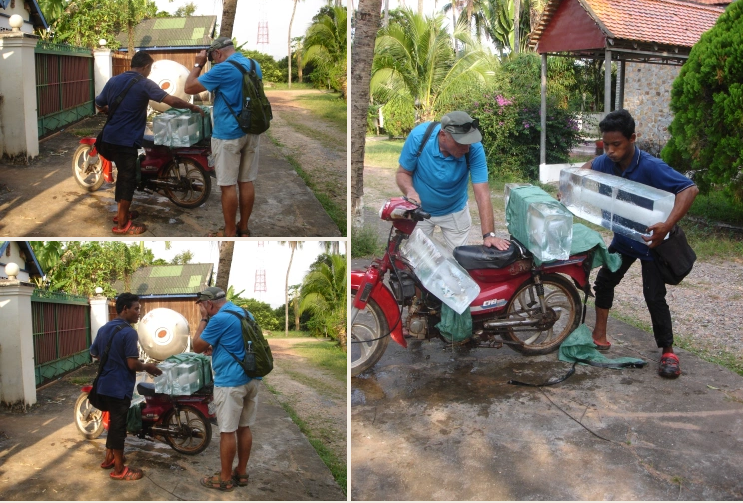 Er hat drei Eisblöcke dabei, die er nun abladen möchte. Da braucht er einen starken Mann, der sein Moped hält.