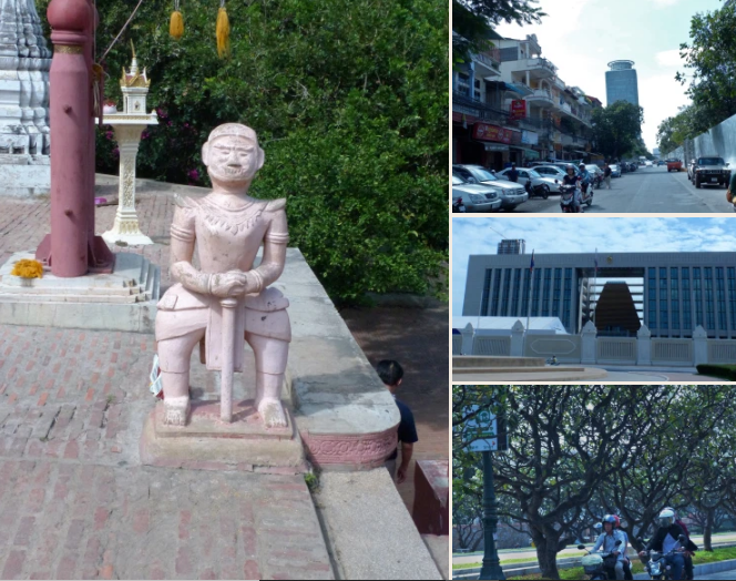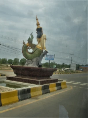 Die Straße ist großzügig sechsspurig angelegt mit begrüntem Mittelstreifen, ausladenden Lampen und mehreren Kreiseln mit Statuen wie ein weißes Pferd und hinduistische Gottheiten.