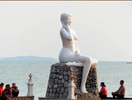 Im Meer winkt eine Krabbenstatue – das Wahrzeichen der Stadt – denn Kep ist bekannt für seine Meeresfrüchte und hat einen täglichen Krabbenmarkt,