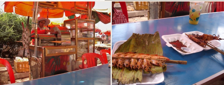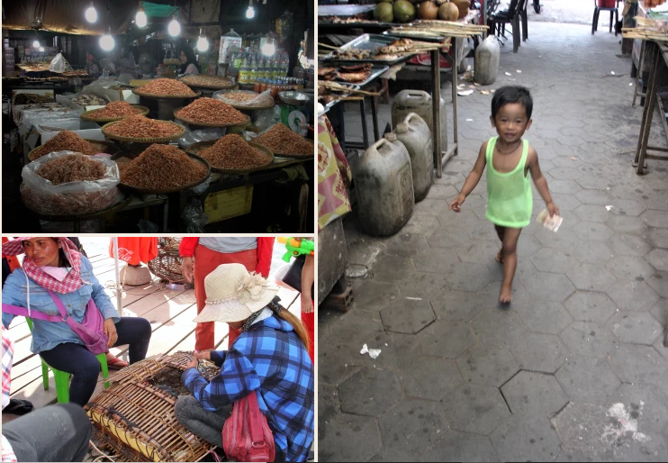 wo man auch essen kann. Direkt daneben gibt es aber auch viele Lokale, in denen das Angebot des Tages gekocht, gebraten oder gegrillt wird, häufig gewürzt mit dem begehrten Kampot-Pfeffer, der hier in der Umgebung wächst.