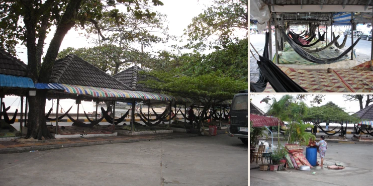 Gegenüber auf der anderen Straßenseite noch ein anderer Service, zwischen im Quadrat aufgestellten Pfosten – darüber ein Dach — sind Hängematten befestigt. Auch die Besitzer nutzen sie gern für ein Schläfchen zwischendurch. Der Weg ins Wasser führt durch angeschwemmtes Seegras, durchsetzt mit Plastikmüll. Der Müll wird ebenfalls vom Meer her ans Ufer getrieben, aber die Menschen am Strand verstehen es offenbar als Aufforderung, ihrerseits ihre Hinterlassenschaften wie Essensreste oder Verpackungsmüll am Strand liegen zu lassen.