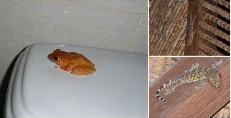 Und jetzt sind wir erst einmal froh, in dieser kleinen gepflegten Anlage in Kep – nicht weit von der Grenze entfernt – angekommen zu sein. Wir hatten zuerst nur eine Nacht gebucht, aber wir fühlen uns so wohl, dass wir um zwei Tage verlängern, mehr ist nicht möglich, weil die acht Quartiere zum Wochenende ausgebucht sind. Zwar müssen wir täglich in einen anderen Bungalow umziehen, aber mit Hilfe der unglaublich netten Mitarbeiterinnen ist das jedes Mal in fünf Minuten passiert. Nach unserer Empfindung haben wir die Seelen noch nicht genug baumeln lassen, deshalb ziehen wir noch für weitere vier Tage in eine ca. zwei Kilometer entfernte Anlage um. Die hat zwar keinen Pool wie die erste, aber auch einen schönen Garten und angenehme Bungalows und sie liegt näher zum Strand und zum Crabmarket. Zu unserer Freude haben wir einen orangefarbenen Frosch und mehrere Tokkays (Riesengeckos) als Mitbewohner.