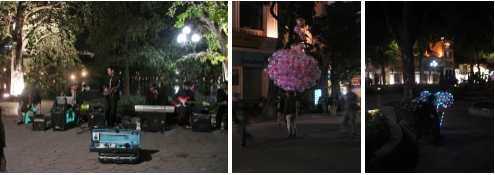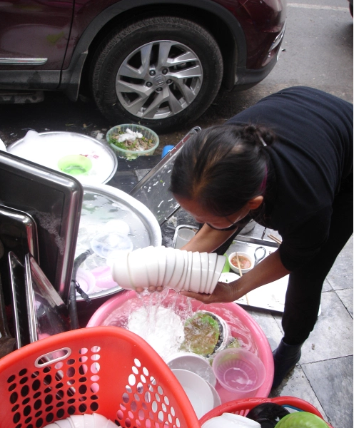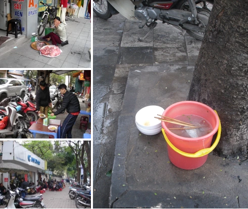 Die Anzahl der Suppenküchen ist unüberschaubar, hier wird vorbereitet, gekocht, serviert und gespült. Mittags sitzen elegant gekleidete Menschen neben ärmlich aussehenden auf kleinen Plastikhockern und verzehren Suppe, Gegrilltes oder was sonst so angeboten wird. Danach ziehen sie ihre Atemschutzmaske – gerne modisch auf die Kleidung abgestimmt – wieder an und laufen durch Lärm und Abgasgestank zurück zu ihrem Arbeitsplatz.