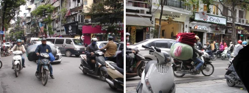 Wo keine Tischchen und Hocker stehen, wird der Platz als Parkplatz für die Mopeds gebraucht. Wer auf seinen zwei Beinen unterwegs ist, läuft Slalom. Zwischen allem durch, was auf dem Weg aufgebaut ist, und wenn man dort nicht weiterkommt und auf die Straße ausweicht wird man – siehe oben angehupt. Mopeds sind erschwingliche Fortbewegungsmittel für einen Großteil der Bevölkerung und transportieren nicht nur Menschen, sondern unglaubliche Mengen von Waren.