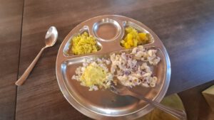 Wir haben inzwischen von einer Assistenzärztin unseren Therapieplan bekommen. Außer den täglichen Massagen muss Klaus 3 Tage lange Reisporridge essen und Ingwerwasser trinken, morgens reicht ihm die Ärztin vor dem Frühstück ein Becherchen warmes Ghee. Ich komme mit verschiedenen Medikamenten und drei Einläufen davon. Dreimal am Tag gibt es vegetarisches Essen, schwach gewürzt, mit frisch gepressten Säften (morgens) und immer leckerem Salat (mittags).
